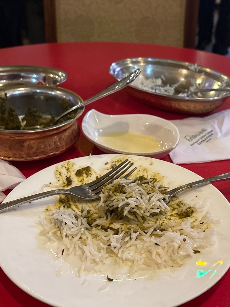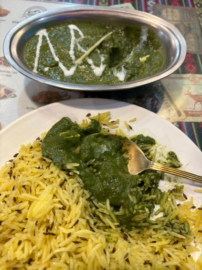 팔락 파니르와 지라 라이스를 같이 먹으면, 꿀떡꿀떡 밥이 잘 넘어간다. 얼핏보면 씨앗이 슬쩍슬쩍 섞인 기름밥과 푸르죽죽한 국물에 빠진 치즈 덩어리지만 저녁 식사로 한 끼 먹으면, 저녁에 새로운 일정을 시작할 든든한 힘이 나기도 한다.